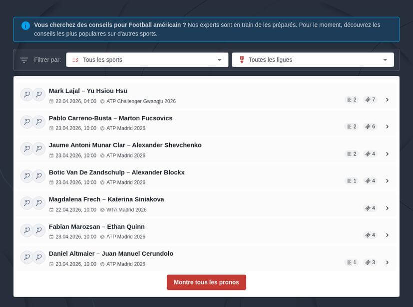 En 2027, la tendance est aux "paris sans risque" ou "No Sweat Bets". Des opĂ©rateurs comme 1XBET et Betwinner proposent des structures oĂč votre premier pari sportif NFL 2027 est remboursĂ© en crĂ©dits de jeu (cashback) s'il est perdant, parfois jusqu'Ă des montants dĂ©passant les 200 âŹ. C'est l'opportunitĂ© idĂ©ale pour tenter un pari audacieux sur un outsider en dĂ©but de saison ou pour effectuer un pronostic NHL pour 2027.