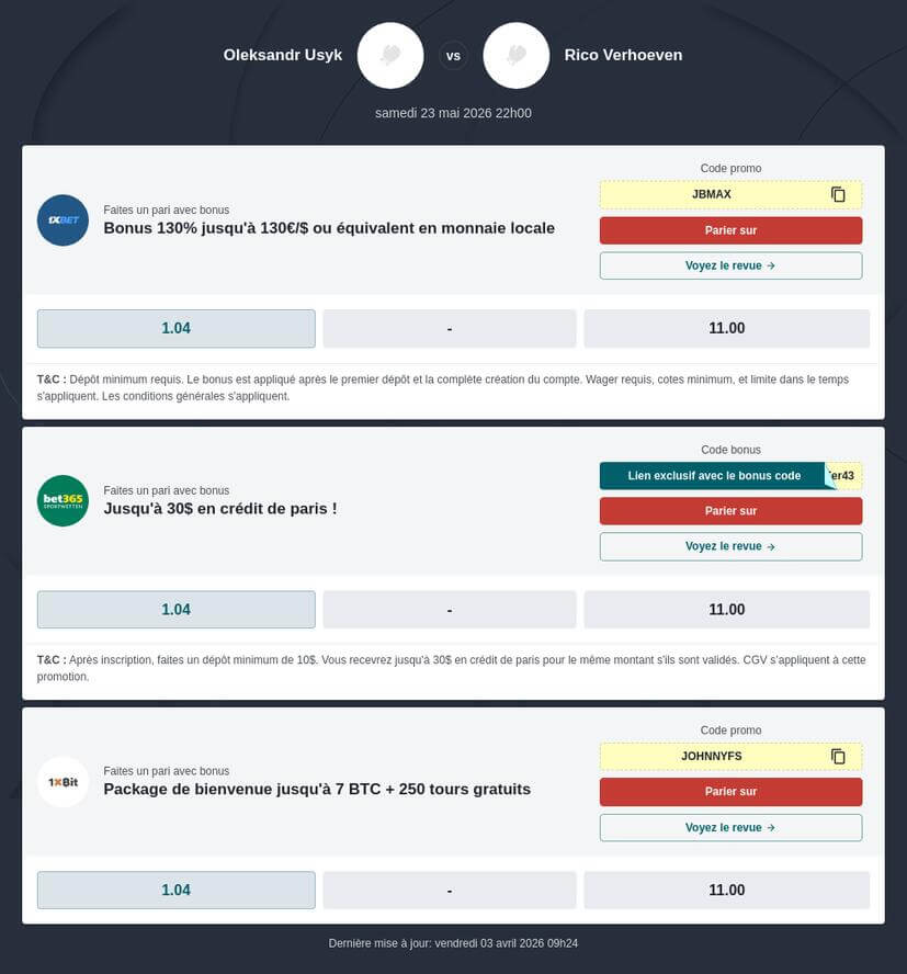 3. Les bookmakers pour le combat Usyk vs Verhoeven
