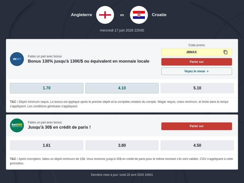 Nous vous recommandons de suivre en direct Angleterre - Croatie chez nos partenaires, sur 1xBET, Betwinner ou Melbet. Ces bookmakers proposent un service de streaming légal HD qui vous permettra d’analyser les performances des joueurs pendant le match grâce aux statistiques avancées fournies. Vous pourrez aussi parier en direct sur ces plateformes via le live betting. Un outil indispensable qui permet d’adapter vos pronostics Angleterre - Croatie 2026 en temps réel. A noter que ces sites de paris sportifs offrent de nombreux bonus inscription CDM 2026. Placez vos paris Croatie vs Angleterre avec le code promo 1XBET et profitez de l'offre spéciale du bookmaker.