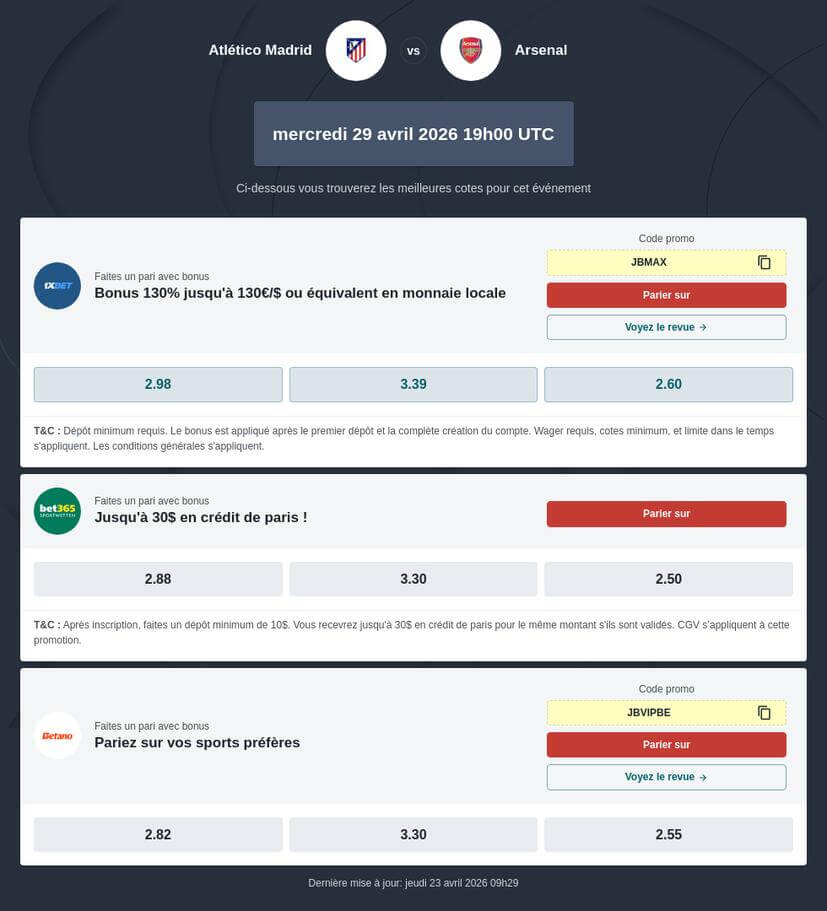 Comment placer un pronostic Atletico vs Arsenal ? Qui est le favori de la demi-finale Atletico Madrid vs Arsenal ? La campagne de Ligue des champions 2025-2026 se poursuit : place aux demi-finales entre l’Atlético Madrid et Arsenal. Une double confrontation qui s’annonce extrêmement serrée. Pour la demi-finale aller, la victoire de l’Atletico est cotée à 2,88, contre 2,50 pour Arsenal (bet365). Le match nul est indiqué à 3,30, ce qui prouve combien les prédictions Atletico - Arsenal sont loin d’être évidentes. Voyons ensemble les offres des meilleurs bookmakers 1XBET, Betwinner, bet365 et Melbet, et les différentes options de paris sportifs Atletico vs Arsenal.