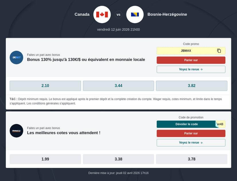 Les premières cotes Canada - Bosnie pour la Coupe monde sont déjà disponibles chez nos partenaires de confiance. Sur 1XBET, la victoire Canadienne est légèrement favorite avec une cote à 2,10 contre 3.83 pour la Bosnie. Sur bet365 propose des marchés de "Clean Sheet" très intéressants. De leur côté, Betwinner et Melbet se distinguent par des bonus de bienvenue boostés pour cette phase de poules permettant d'optimiser votre bankroll Canada vs Bosnie match dès le coup d'envoi. Alors, découvrez tout sur le pronostic Canada vs Bosnie !