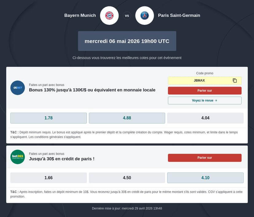 Difficile de dégager un favori Bayern PSG, tant les 2 équipes proposent un football exceptionnel. Cet article vous aide à parier sur Bayern vs PSG, à comprendre les cotes proposées par les bookmakers spécialisés comme 1XBET, bet365, Betwinner et Melbet, et à savoir comment suivre le demi-finale de Ligue des champions en streaming légal.