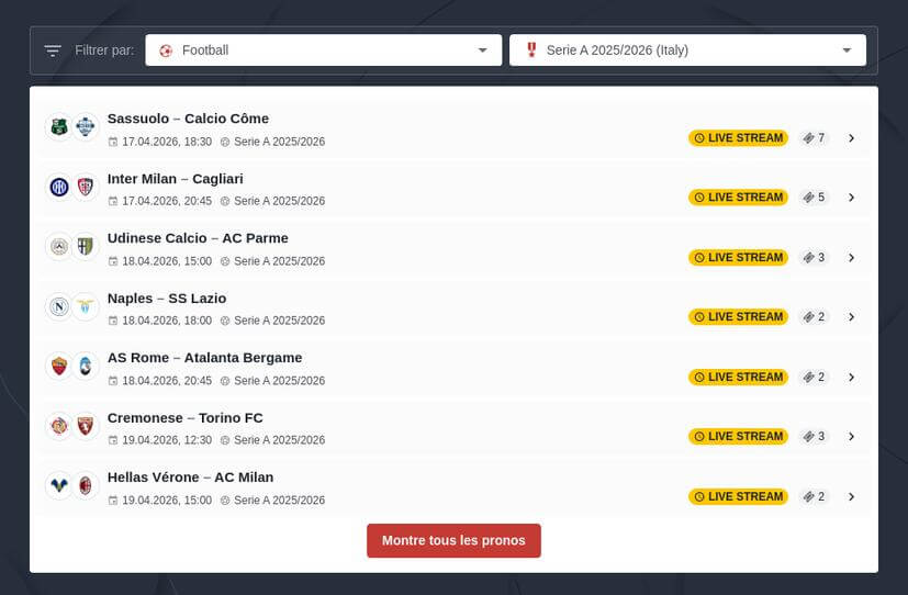 Choisir le football et la Serie A : Sélectionnez le football, puis l'Italie et enfin la Serie A. Cela vous mènera à une liste des matchs à venir.