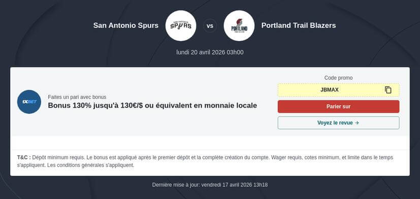 La rencontre 1 du 1er tour des Playoffs entre San Antonio et Portland se disputera ce lundi 20 avril à 3h du matin (heure française) au Frost Bank Center. Le match 2 est prévu le 22/04, le match 3 le 25/04 et le match 4 le 26/04. Nous vous recommandons de suivre les Spurs vs Blazers sur les plateformes 1XBET, bet365, Betwinner et Melbet (surtout avec notre code promo Melbet 2026). Ces bookmakers sont les meilleurs pour parier sur la NBA. En plus de proposer des options de paris attractives et variées, ces sites offrent un système de live betting pour adapter vos pronostics Spurs vs Blazers en temps réel. Parfait pour adapter vos prédictions en fonction des choix tactiques des coachs et de l’évolution de chaque QT.