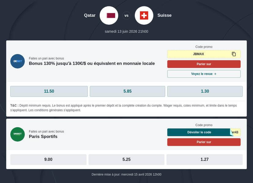 Le match Suisse vs Qatar en direct sera accessible via plusieurs plateformes de streaming légal. Les bookmakers 1XBET, Betwinner, bet365 et Melbet (surtout avec le code promo Melbet) diffusent Qatar vs Suisse, en offrant en parallèle des statistiques en temps réel, ainsi qu’un service de live betting pour adapter vos pronos.