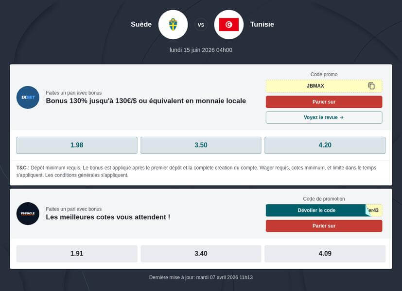 La rencontre Tunisie vs Suède sera à suivre en direct sur les sites de nos top bookmakers, comme 1xBET ou bet365, en général gratuit pour les utilisateurs enregistrés. Ces plateformes diffusent en streaming cette rencontre prévue le 15 juin prochain, et proposent des bonus d’inscription CDM 2026, comme l'offre exclusive de 1XBET, si vous pariez sur le match Tunisie - Suède. Une occasion de bien gérer votre bankroll en ce début de compétition, et de profiter des meilleures cotes proposées par ces bookmakers.