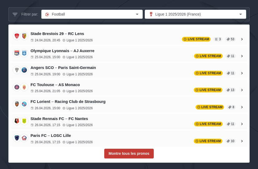 Un critère indispensable pour choisir votre site de pronos, puisque vous pouvez suivre les matchs et profiter de nos astuces pour bien parier en direct. A noter que 1XBET, bet365, Betwinner ou Melbet offrent de nombreux bonus 2027 pour parier sur les événements sportifs.